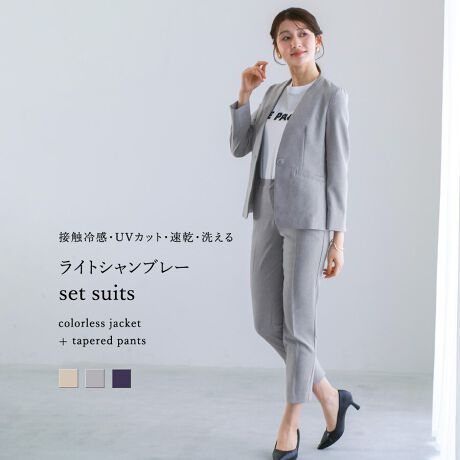 【接触冷感・UVカット・速乾・洗える】ライトシャンブレー・セットスーツ[カラーレスジャケット+テーパ