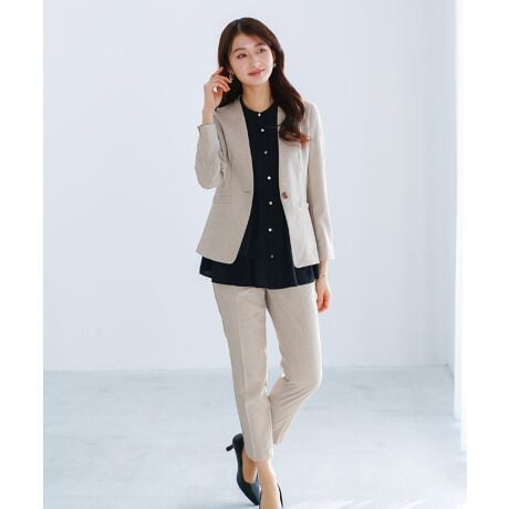 レディーススーツ 夏スーツ セットアップ カラーレスジャケット テーパードパンツ ライトシャンブレー UVカット クールタッチ 速乾 洗えるスーツ