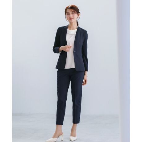 レディーススーツ 夏スーツ セットアップ カラーレスジャケット テーパードパンツ ライトシャンブレー UVカット クールタッチ 速乾 洗えるスーツ