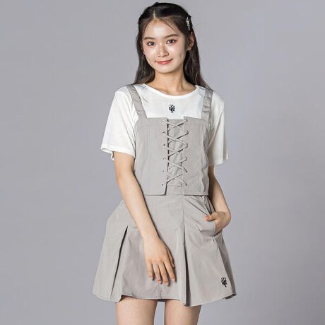 フロントのレースアップ(スピンドル)がポイントのビスチェは、着るだけでウエスト位置を高く見せて「脚長効果」バツグン♪