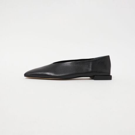 長さのあるつま先に、すっきりとしたスクエアトゥが印象的なフラットシューズ。