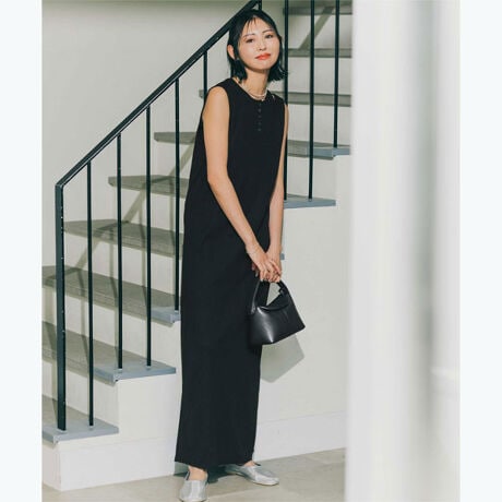 タンクトップはトレンド感のあるヘンリーネックデザインで、程よくカジュアルな印象に仕上げました。