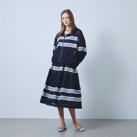 マルチボーダーの織柄と透け感をMIXさせたオリジナル生地です。程よい透け感のあるトレンドスカート。 シンプルなTシャツも格上げしてくれるスカートです。
