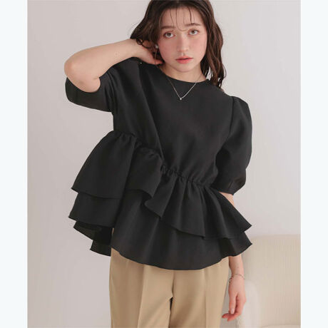 ・動きのあるイレギュラーヘムが目を惹く、着るだけで華やぐペプラムトップス