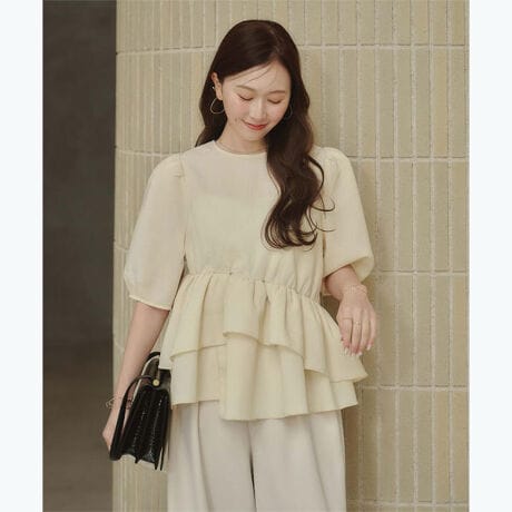 ・動きのあるイレギュラーヘムが目を惹く、着るだけで華やぐペプラムトップス