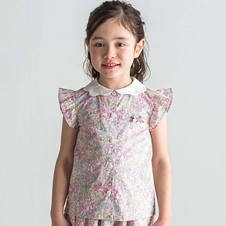 品のあるリバティ柄の生地を使用し、スカラップ襟と袖フリルが可愛い女の子用ブラウスです。