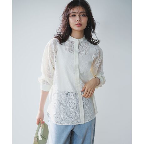 ■デザイン繊細なブロックレース素材を使用した、上品な華やかさが魅力のバンドカラーブラウス。バンドカラーのデザインが甘くなりすぎず、大人の女性にも取り入れやすい一着です。羽織としても着用でき、合わせるインナー次第でロングシーズン活躍します。普段使いからお出かけまで、幅広いシーンで着回しを楽しめるアイテムです。