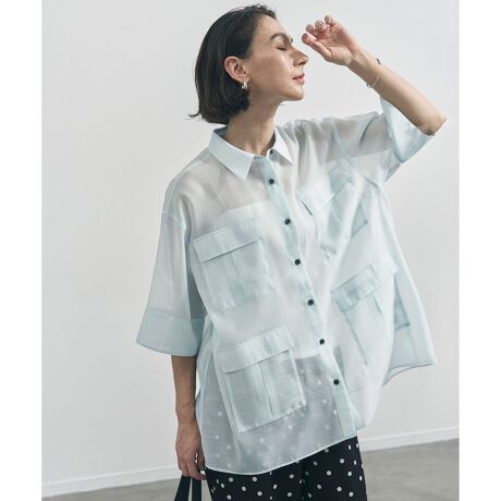 ■デザイン涼しげなシアー素材で仕立てたサファリシャツ。サファリジャケットのポケットを、女性らしいバランスにアレンジし仕上げました。キャミソールなどの上からサッと羽織るだけで、旬のスタイルが完成します。ボディラインを上手にカバーし、体から離れるサイズ感もポイント。一枚でももちろん、タンクトップやワンピースの羽織りとして暑い時期まで長く活躍する一着です。