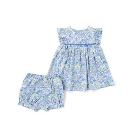 品のあるリバティ柄の生地とフリル袖、胸元のリボンが可愛らしい印象のワンピースとブルマのベビースーツです。