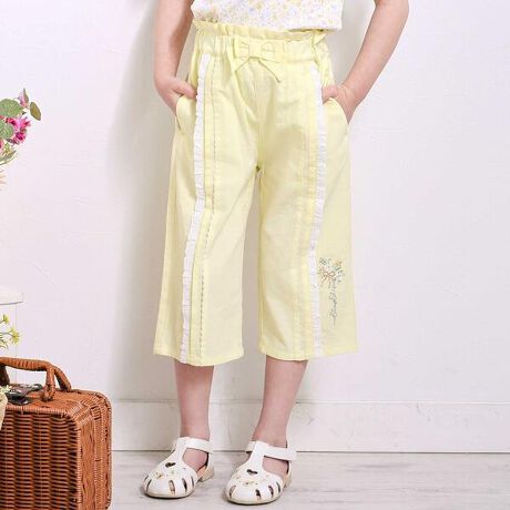 ウエストのリボンやたっぷりあしらったレースが、女の子らしい可愛さを引き立てる7分丈パンツ。