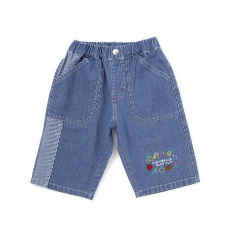 ライトオンスデニムにヒッコリーストライプの切り替えが映える、カジュアルさの中に遊び心を詰め込んだ男の子用5.5分丈パンツ。