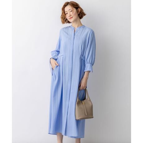 ウエストに施されたタック使いとサイドのバックルディテールが、ボディラインを美しく見せるワンピース。襟元はバンドカラーですっきりと仕上げ、知的な印象に。ウエストタックの効果ですっきりとしたシルエット。またサイドのバックルでウエストの絞りを調整できるため、その日の気分やスタイリングに合わせてシルエットを変化させることができます。前ボタンを全て開ければ、軽やかな羽織りとしても活躍する2WAY仕様。季節の変わり目のライトアウターとしても重宝します。 カラーは、爽やかな印象のスカイブルー(#172)、知的な品を感じるネイビー(#175)の2色展開です。