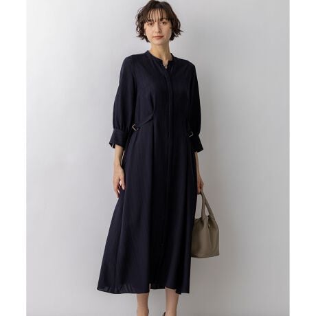ウエストに施されたタック使いとサイドのバックルディテールが、ボディラインを美しく見せるワンピース。襟元はバンドカラーですっきりと仕上げ、知的な印象に。ウエストタックの効果ですっきりとしたシルエット。またサイドのバックルでウエストの絞りを調整できるため、その日の気分やスタイリングに合わせてシルエットを変化させることができます。前ボタンを全て開ければ、軽やかな羽織りとしても活躍する2WAY仕様。季節の変わり目のライトアウターとしても重宝します。 カラーは、爽やかな印象のスカイブルー(#172)、知的な品を感じるネイビー(#175)の2色展開です。