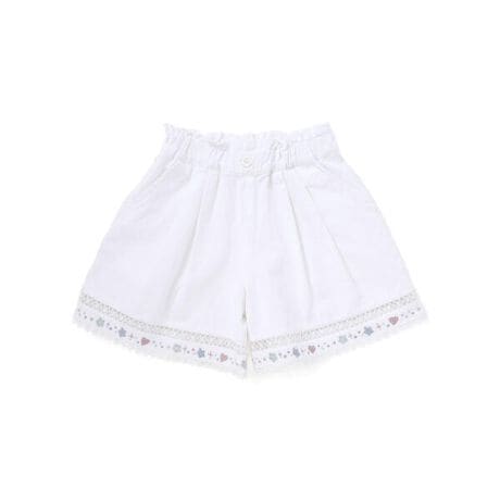 裾にふんわりと透け感のあるレースをあしらった、夏らしく軽やかな女の子用ショートパンツ。