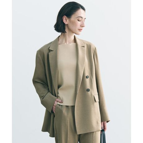 ■デザインさらっと羽織りやすく軽やかな着心地が魅力の、リネンライクな風合いのジャケット。ダブルブレストでマニッシュな雰囲気を持ちながらも、程よいドロップショルダーと肩パットのない仕様で、抜け感のあるスタイルが完成します。オンオフ問わず着まわせる万能アイテムです。同素材のボトムスと、セットアップでご着用いただけます。