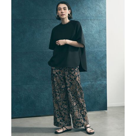 ■デザインシーズンムードを高めるプリントイージーパンツ。落ち感のある素材で広がりすぎず、すっきり着こなしやすいワイドシルエットがポイントです。ウエストはゴム仕様になっているので、らくにご着用いただけます。スタイリングのアクセントになる「ドット」、「ボタニカル」、「ペイズリー」の3柄展開です。