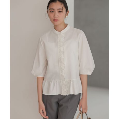 ■デザイン・前立てのフリルがヒヨク使いのバンドカラーのペプラムシャツは1枚で着映え間違いなし。・袖山のタックでボリュームを出した5分袖丈は気になる二の腕をカバーしてくれます。・前丈が少し短めの前後差のある丈感なのでボトムスを選ばないスタイリングの幅の広さも魅力です。
