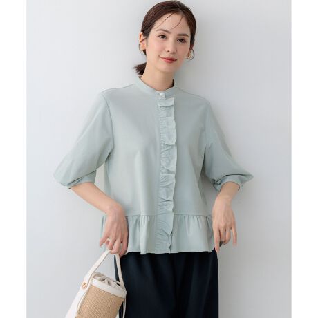 ■デザイン・前立てのフリルがヒヨク使いのバンドカラーのペプラムシャツは1枚で着映え間違いなし。・袖山のタックでボリュームを出した5分袖丈は気になる二の腕をカバーしてくれます。・前丈が少し短めの前後差のある丈感なのでボトムスを選ばないスタイリングの幅の広さも魅力です。