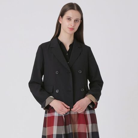 [型番:55F07733__]◆程よくシアー感のある涼し気ショートジャケット【Design】今年らしいクロップド丈のテーラードショートジャケット。コンパクトなサイズ感で、カーディガンのように気軽に羽織るだけでスタイリングが決まる一着です。袖口裏にはクレストブリッジチェックを施しており、カフスをくるりと折り返して着用することで、さりげないアクセントになります。【Fabric】接触冷感、吸水速乾、防シワ機能を備えた素材です。