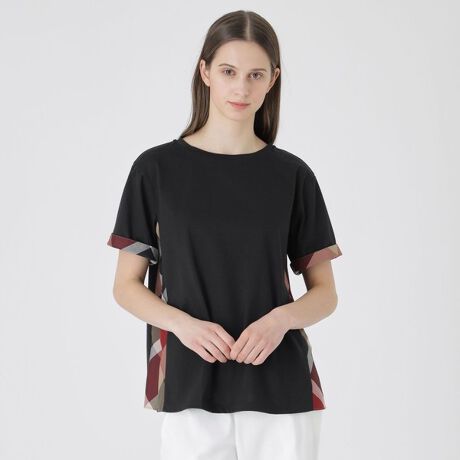 [型番:55P10739__]◆サイドのクレストブリッジチェックがポイントのTシャツ【Design】両脇のクレストブリッジチェック切り替えがポイントのカットソー。お尻まで隠れるゆったりとしたシルエットで、体型カバーも叶える一枚。シンプルながらもブルーレーベルらしいアイテムです。【Fabric】接触冷感を備えた素材です。