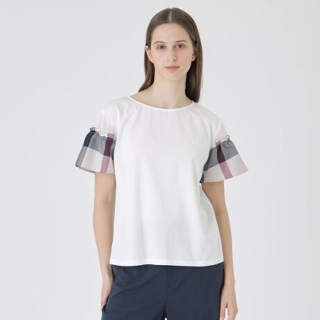 肌触りの良い天竺素材に、オリジナルチェック生地とシアー素材を組み合わせた、異素材ドッキングのカットソープルオーバー。
