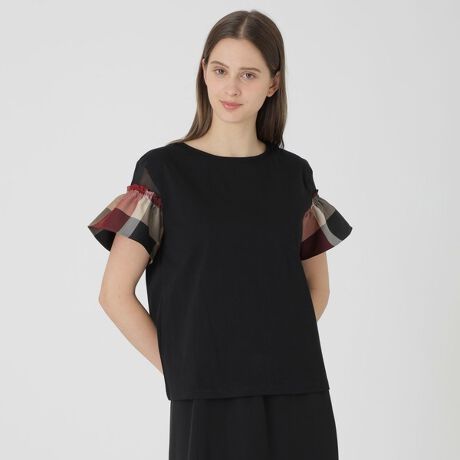 肌触りの良い天竺素材に、オリジナルチェック生地とシアー素材を組み合わせた、異素材ドッキングのカットソープルオーバー。