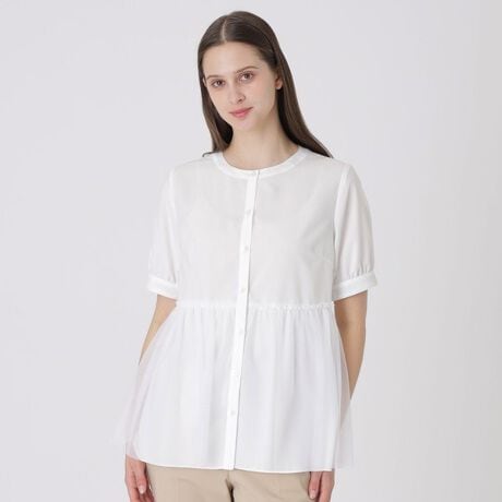 トレンド感あふれるペプラムシルエットの半袖ブラウス。