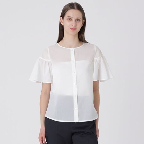 [型番:55M04735__]◆クレストブリッジチェックが華やかなブラウス【Design】適度な透け感のあるオーガンジー素材と、ボリュームのあるフレア袖が可愛い、クレストブリッジチェックのブラウス。きれいめはもちろん、デニムと合わせてカジュアルダウンしてもバランスよく決まり、幅広い着こなしが楽しめます。