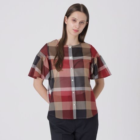 [型番:55M04735__]◆クレストブリッジチェックが華やかなブラウス【Design】適度な透け感のあるオーガンジー素材と、ボリュームのあるフレア袖が可愛い、クレストブリッジチェックのブラウス。きれいめはもちろん、デニムと合わせてカジュアルダウンしてもバランスよく決まり、幅広い着こなしが楽しめます。