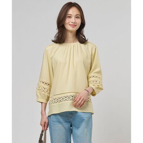 ■デザイン種類の異なる刺繍レースを贅沢にあしらった、華やかで涼しげなブラウス。ネックラインにタックを施すことで、デコルテをきれいに見せてくれます。ボディラインを拾いにくいゆとりあるシルエットが、気になる部分をカバーしてくれる、安心感のある着心地です。繊細な刺繍ディテールが春の空気とマッチして、女性らしい軽やかさのある着こなしにしてくれます。きれいめなパンツと合わせればオフィスシーンに、デニムと合わせれば大人の休日スタイルにと、オンオフ問わず活躍する1着です。カラーは、大人っぽく上品なオフ(#001)、顔周りをぱっと明るくするイエロー(#042)、爽やかで洗練された印象のダルブルー(#074)、シーンレスに活躍するネイビー(#075)の4色展開です。