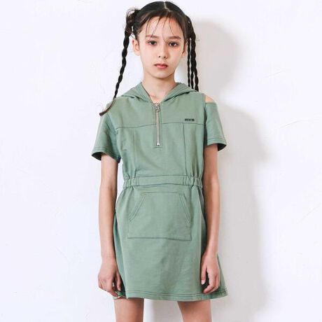 肩あきデザインとハーフジップ仕様が目を引く、トレンド感満載のフードワンピースです。