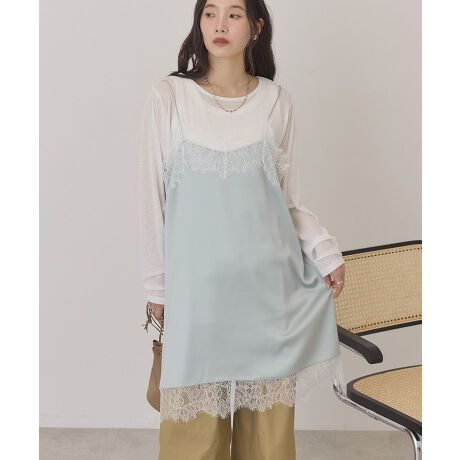 滑らかな光沢のサテン生地と、胸元・裾にあしらわれた繊細なレースが目を引くキャミソールワンピース。