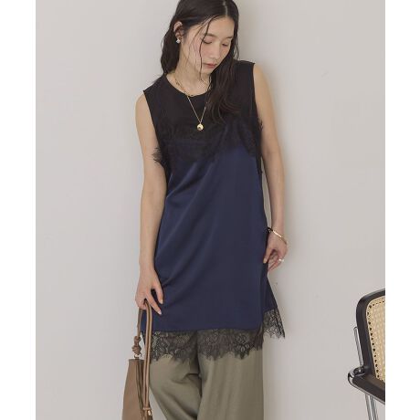 滑らかな光沢のサテン生地と、胸元・裾にあしらわれた繊細なレースが目を引くキャミソールワンピース。