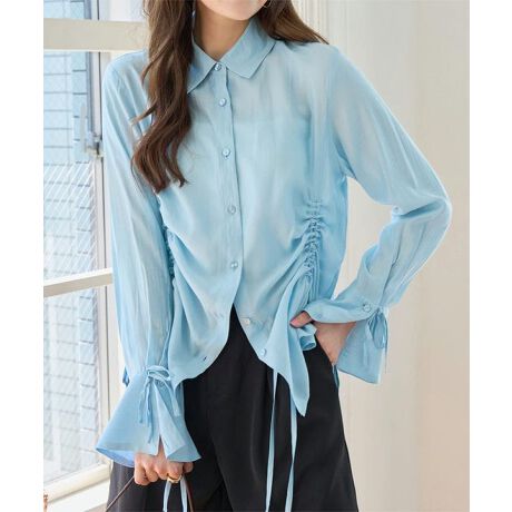 サイドに寄せたギャザーデザインが、着こなしにほどよい立体感を添えるデザインシャツ。