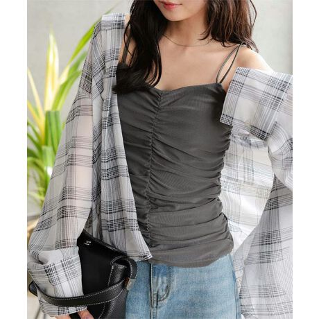 繊細なチュール素材にシャーリングをたっぷり効かせ、華やかさと女性らしさを引き立てるキャミソールトップス。