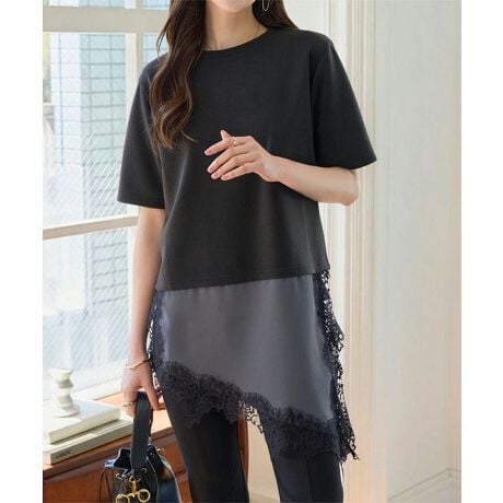 プルオーバーの裾に繊細なレースをドッキングした、アシンメトリーレースドッキングプルオーバー。