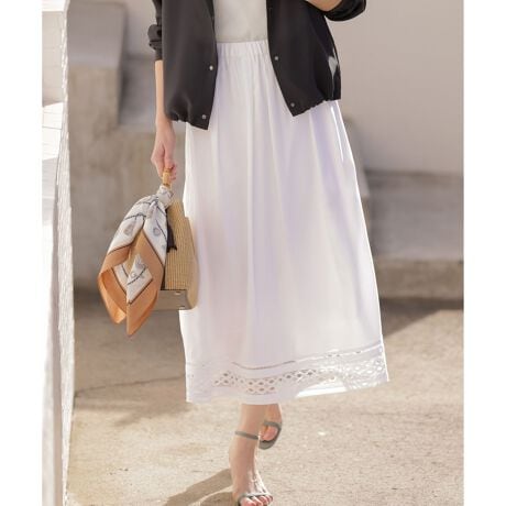 ■デザイン裾に施された繊細な刺繍レースが目を惹くギャザースカート。裾に向かってふんわりと広がる分量感のあるシルエットが、歩くたびに優雅な揺れ感を演出します。裾には2種類の異なる刺繍ディテールをあしらい、シンプルな中に華やかさと涼しげな抜け感をプラスしました。ウエスト周りはランダムなタックを入れることで、お腹周りのラインを拾いにくく、すっきりとした印象に仕上げています。さらに、ウエストは総ゴム仕様になっているので、ストレスフリーな着心地も魅力です。デイリー使いはもちろん、ちょっとしたお出かけやリゾートシーンにも映える、1枚あると嬉しいアイテムです。カラーは、大人っぽく上品なオフ(#001)、爽やかで洗練された印象のダルブルー(#074)、シーンレスに活躍するネイビー(#075)の3色展開です。