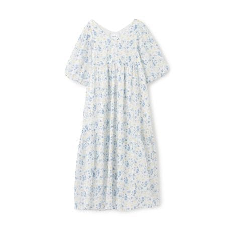 たくさんのお花が描かれている女の子らしい華やかなワンピースです。首元をすっきりと見せるVネックデザインが、顔周りを美しく演出します。フェミニンな印象を与える、丸みのあるボリュームスリーブも魅力。リラクシーなシルエットで快適に着用でき、デイリーユースにもおすすめです。【おすすめの着用時期は春夏シーズン】