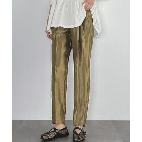 トレンドの光沢素材を使用したタックテーパードパンツ。