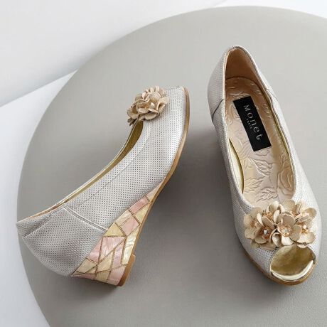 ヒールがありながらもスニーカーのような安心感があり、インソールの花柄エンボス加工など、見えない部分にもさりげない可愛らしさを添えた一足です。