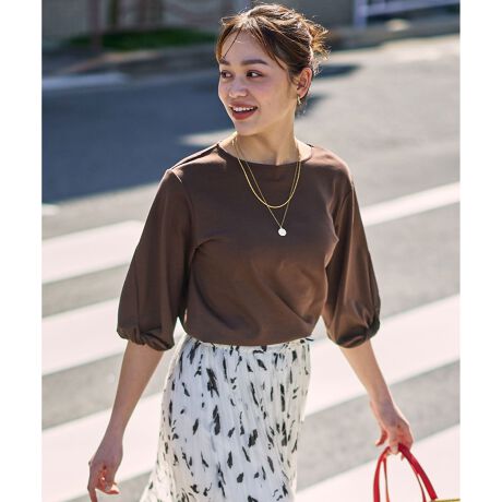 ・立体的に作られた、ツイストスリーブがデザインポイントのプルオーバー・インでもアウトでも合わせやすい程よい丈感・カットソー素材のため、フェミニン見えしすぎず着用しやすい