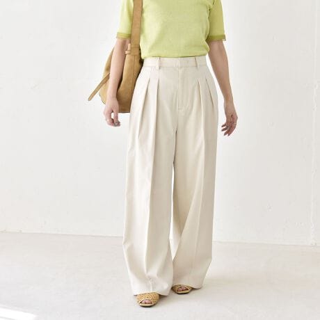 フロントに施したタックが腰まわりに程よいゆとりを持たせ、裾に向かってすとんとまっすぐ落ちる美シルエットで◎