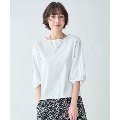 ・立体的に作られた、ツイストスリーブがデザインポイントのプルオーバー・インでもアウトでも合わせやすい程よい丈感・カットソー素材のため、フェミニン見えしすぎず着用しやすい
