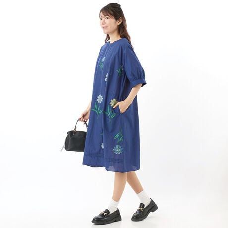 [型番:34120362]ガーベラとサクラコマチの刺繍を大胆に施したワンピース。適度な密度に織り上げたローン生地を使用していて透けないため、暑い季節でも心地よくご着用いただけます。後ろ開きファスナーには共地で引手を付けました。シンプルなシルエットですが、一枚で着映えするアイテムです。丈が長いアイテムにあると嬉しいポケット付き。