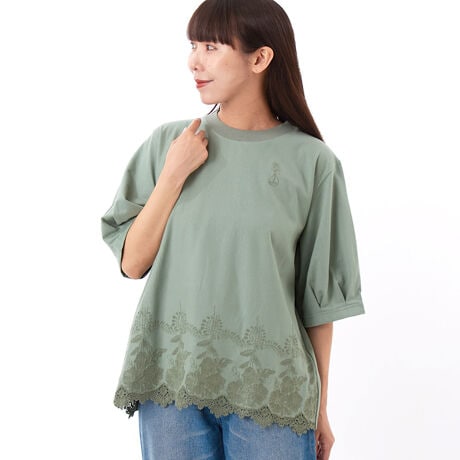 [型番:34950062]夏らしくシャリ感のあるミニ裏毛を使用したTシャツ。裾に施したケミカル刺繍のスカラップが贅沢な一枚です。胸元には、小さな花瓶にお花を生けたワンポイント刺繍をあしらいました。ポイントで入れたタックが洗練された印象を与えます。袖口と後ろ見返しにはアーカイブのプリント生地を使用して、細部までこだわった一着です。