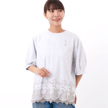 [型番:34950062]夏らしくシャリ感のあるミニ裏毛を使用したTシャツ。裾に施したケミカル刺繍のスカラップが贅沢な一枚です。胸元には、小さな花瓶にお花を生けたワンポイント刺繍をあしらいました。ポイントで入れたタックが洗練された印象を与えます。袖口と後ろ見返しにはアーカイブのプリント生地を使用して、細部までこだわった一着です。