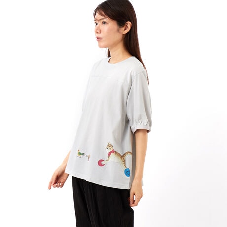 脇線を後ろにまわし、前から後ろにかけて猫と鳥のプリントがかわいらしい一枚です。