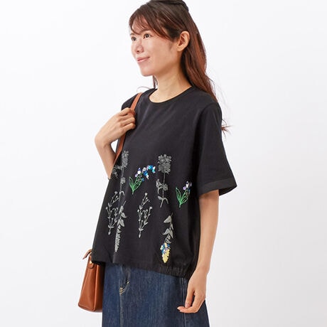 [型番:34950562]発泡プリントを施し、刺繍のように仕上げたデザインTシャツ。単色のプリントの中に、彩り豊かな花々がポイントで咲く柄です。両サイドの裾には布帛をあしらい、裾にゴムを入れてふんわりとしたボリュームを出しました。ベーシックなカラー展開で、コーディネートに取り入れやすい一枚です。