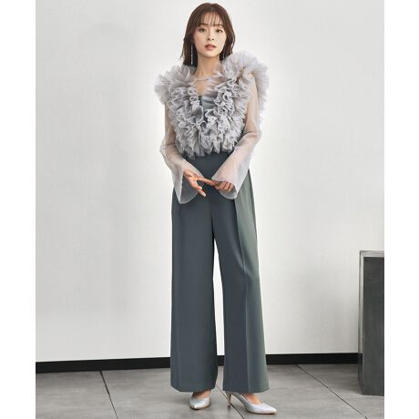 華やかなギャザーチュールを施したブラウスとオールインワンの2点セットパンツドレスになります。