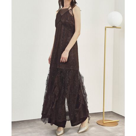 キャミワンピは裾に無地チュールの三角マチとラッフルフリルをあしらい、動くたびに華やかな揺れ感を演出。